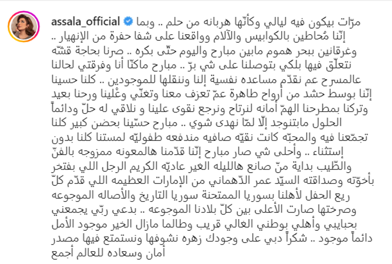 وأضافت أصالة: "إمبارح ما كنّا أنا وفرقتي لحالنا عالمسرح عم نقدم مساعدة نفسية إلنا وننقلها للموجودين، كلنا حسينا إننا بوسط حشد من أرواح طاهرة عم تعزف معنا وتغني وعلينا ورحنا بعيد وتركنا بمطرحنا الهم أمانة، لنرتاح ونرجع نقوى علينا نلاقي له حل، ودائما الحلول ما بتنوجد إلا لما نهدى شوي".