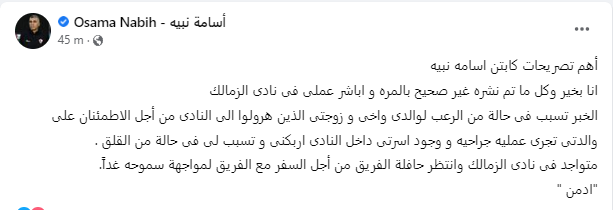 وقالت الصفحة الرسمية لأسامة نبيه عبر فيس بوك، "أنا بخير وكل ما تم نشره غير صحيح بالمرة وأباشر عملى فى نادى الزمالك.. الخبر تسبب فى حالة من الرعب لوالدى وأخى وزوجتى الذين هرولوا إلى النادى من أجل الاطمئنان على.. والدتى تجرى عملية جراحية ووجود أسرتى داخل النادى أربكنى وتسبب لى فى حالة من القلق".
