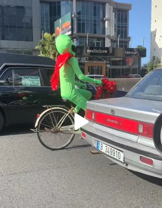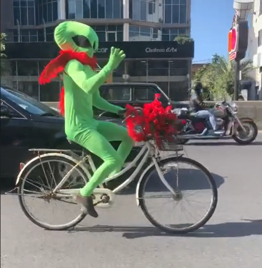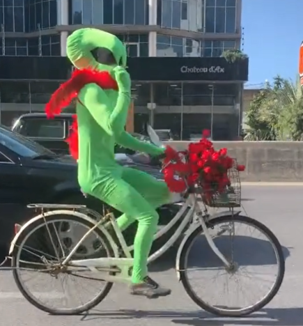 بهذه الكلمة “alien alien”، متنقلًا بدراجته بين السيارت على طريق عام كما أرسل لهم قبلة عندما لاحظ تصويرهم له مقريين بأنه «فكرته مجنونة» دون الكشف مكان تصويره من داخل سيارتهما، كما ذكر أنه في 14 فبراير من كل عام يكسي اللون الأحمر الشوارع في مختلف دول العالم للاحتفال بـ الفلانتين الذي تتعددت الروايات حول أصل قصته.