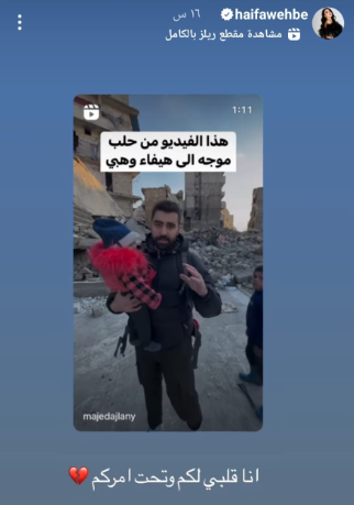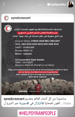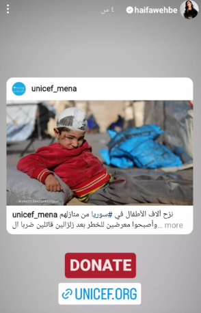 كما نشرت الفنانة اللبنانية هيفاء استغاثة “اليونيسف” منظمة الأمم المتحدة للطفولة المكتوب بداخلها: «نزح آلاف الأطفال في سوريا من منازلهم، وأصبحوا معرضين للخطر بعد زلزالين قاتلين».