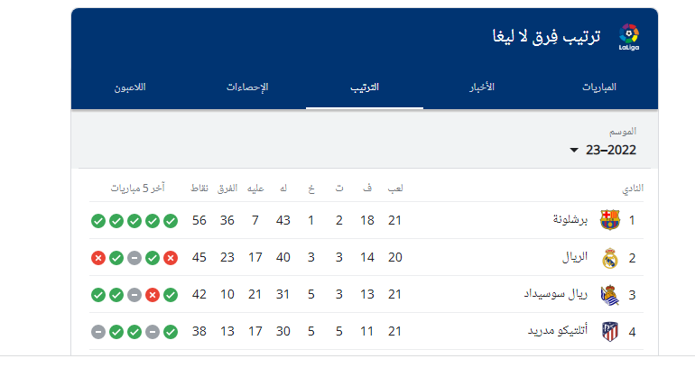 جدول ترتيب الدوري الإسباني الممتاز قبل مباريات اليوم الأربعاء 15_2_2023
