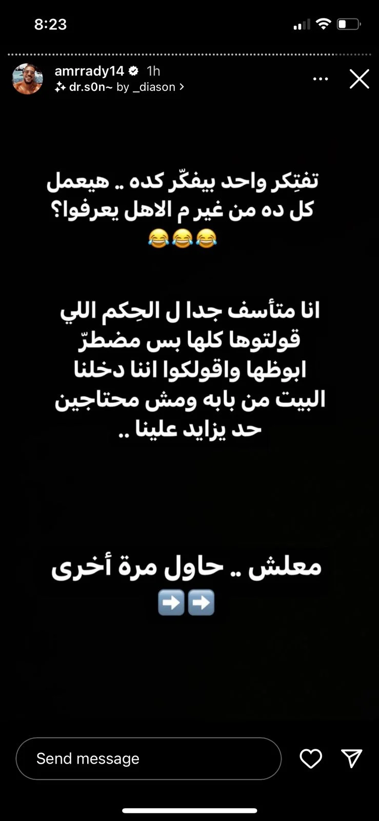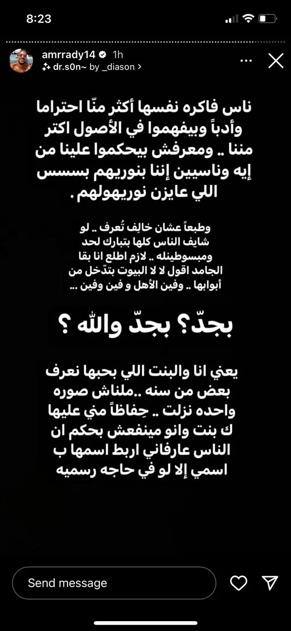 وتابع راضي: ناس فاكرة نفسها أكثر منا احترامًا وأدبًا وبيفهموا في الأصول أكتر مننا.. ومعرفش بيحكموا علينا من إيه وناسيين إننا بنوريهم وبسس اللي عايزين نوريهولهم.. يعني أنا والبنت اللي بحبها نعرف بعض سنة.. ملناش صورة واحدة نزلت.. حفاظًا مني عليها وبحكم إن الناس عارفاني أربط اسمها باسمي إلا لو في حاجة رسمية.