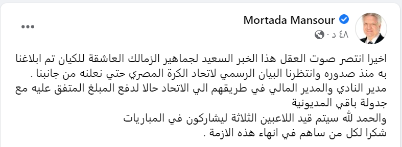 وكتب مرتضى منصور، عبر صفحته الشخصية على موقع التواصل الاجتماعي "فيسبوك": "أخيرا انتصر صوت العقل هذا الخبر السعيد لجماهير الزمالك العاشقة للكيان تم إبلاغنا به منذ صدوره وانتظرنا البيان الرسمي لاتحاد الكرة المصري حتى نعلنه من جانبنا".