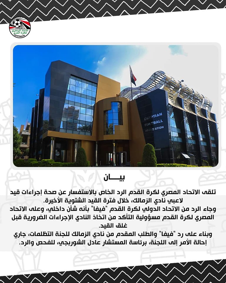 وقال الاتحاد في بيان رسمي: "تلقى الاتحاد المصري لكرة القدم الرد الخاص بالاستفسار، عن صحة إجراءات قيد لاعبي نادي الزمالك، خلال فترة القيد الشتوية الأخيرة".