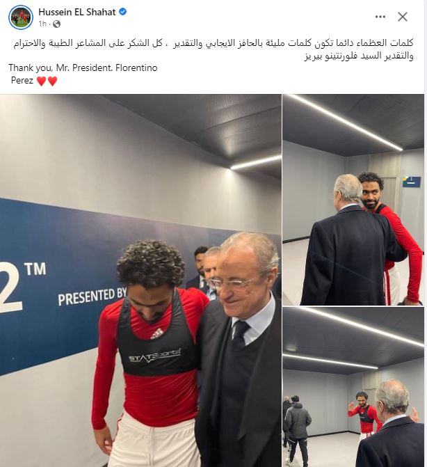 ونشر حسين الشحات صور تجمعه برئيس ريال مدريد، بيريز، عبر حسابه بموقع التواصل الاجتماعي "فيسبوك"، بعد أن تربع على صدارة الأكثر مشاركة في تاريخ الأهلي بكأس العالم للأندية بواقع 12 مباراة، جمعها مع الأهلي "9 مباريات" ونادي العين الإماراتي "3 مباريات".