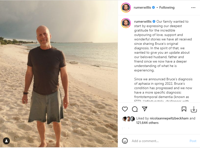 حيث أضافت عائلة بروس ويليس: "منذ أن أعلنا تشخيص بروس للحبسة الكلامية فى ربيع عام 2022، تقدمت حالة بروس ولدينا الآن تشخيص أكثر تحديدًا: الخرف الجبهي الصدغي (المعروف باسم FTD).. لسوء الحظ، فإن تحديات التواصل ليست سوى عرض واحد من أعراض المرض الذي يواجهه بروس.. في حين أن هذا مؤلم، فمن المريح أن يكون لديك تشخيص واضح في النهاية".