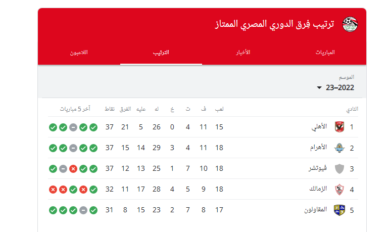 حيث يبحث عشاق كرة القدم حول جدول ترتيب بطولة الدوري المصري الممتاز لكرة القدم بنسخته الجارية 2022-2023 بعد انتهاء الجولة الـ18.