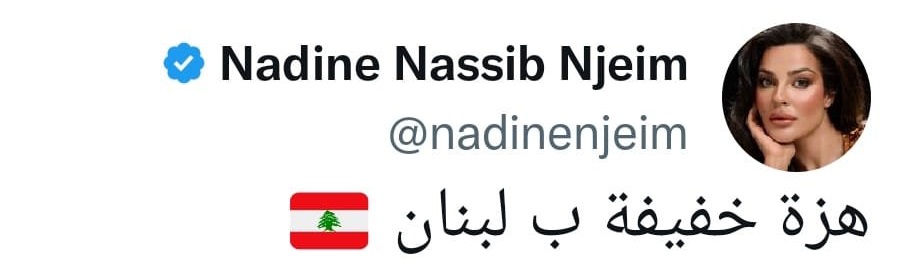 كما كتبت نادين نسيب نجيم عبر حسابها الشخصي لموقع تويتر عن الهزة الأرضية الجديدة في لبنان، قائلة: "هزة خفيفة بلبنان".