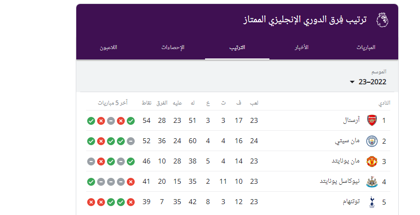 ولدى أرسنال 54 نقطة من 23 مباراة ويملك مباراة واحدة مؤجلة.