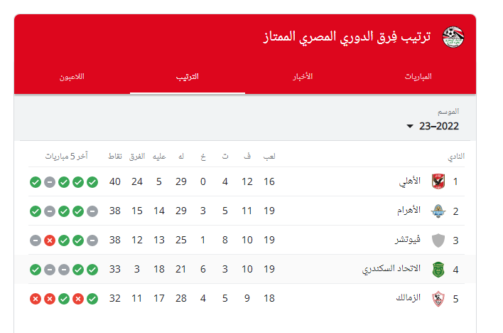 بعد مبارة الإسماعيلي ضد القناة.. ما هو ترتيب الدوري المصري 2022_2023؟